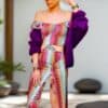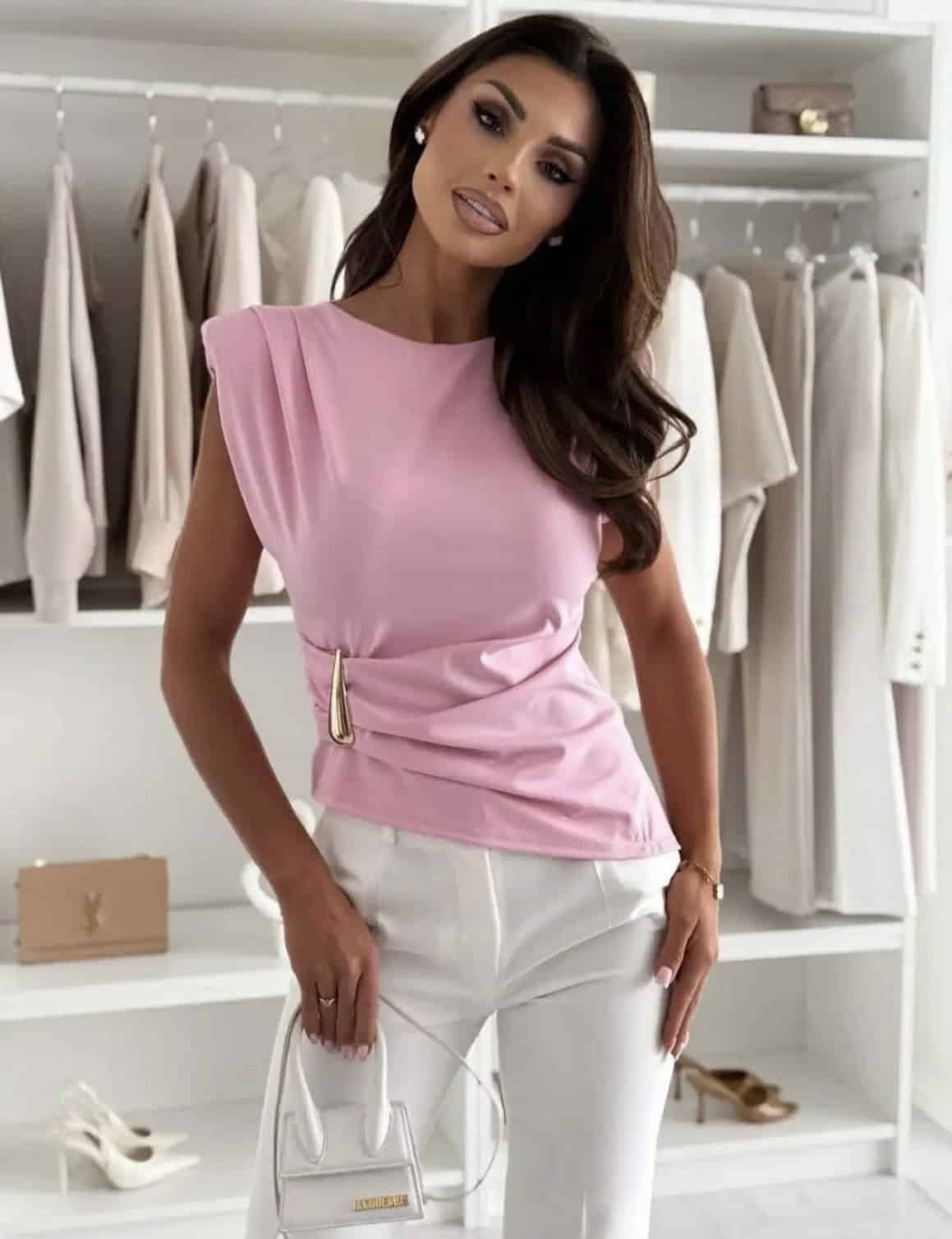 Blouse sans manches, froncé sur un coté par une épingle dorée.