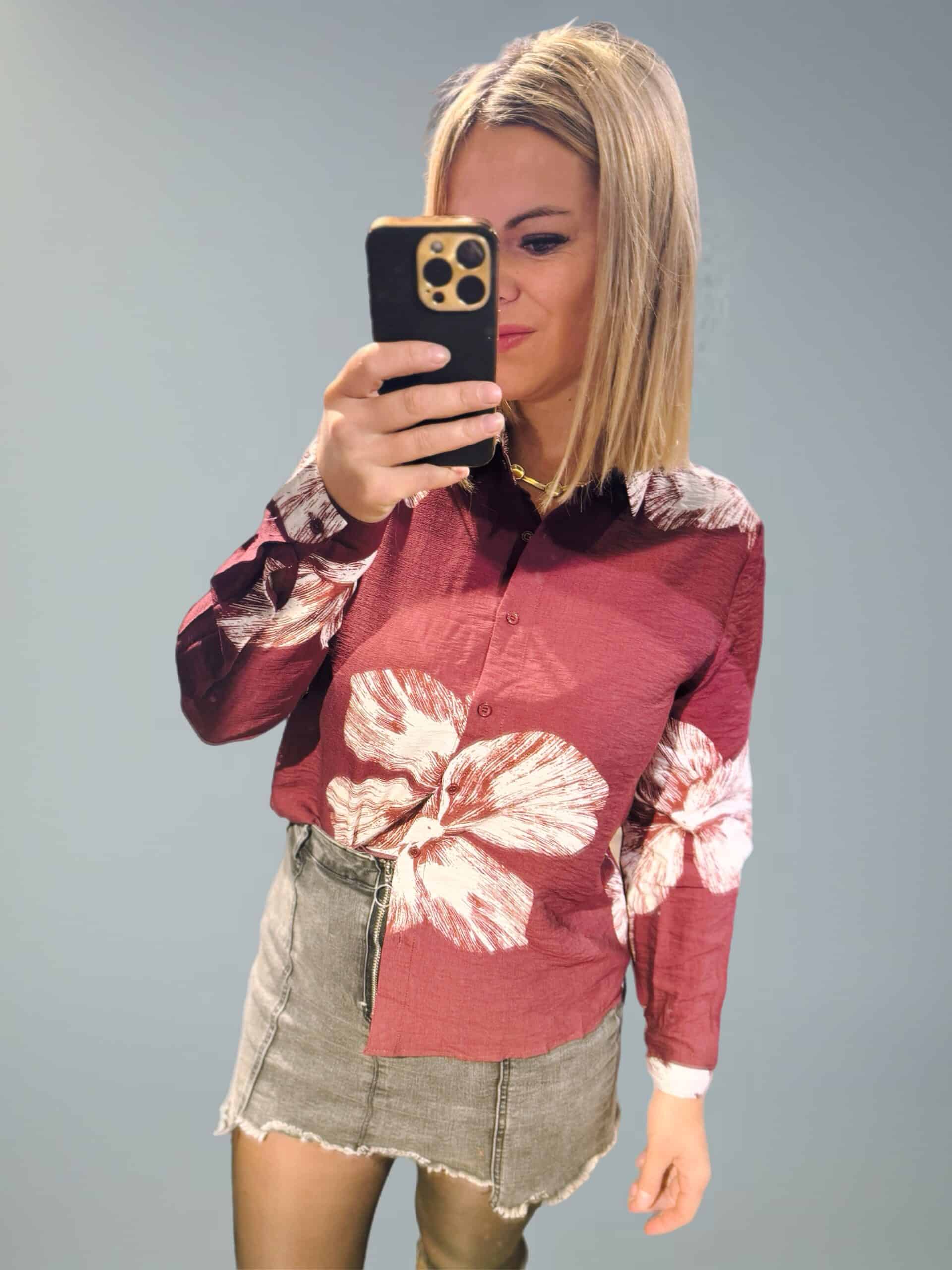 Chemise bordeaux foncée, avec des motifs de feuilles blanches.