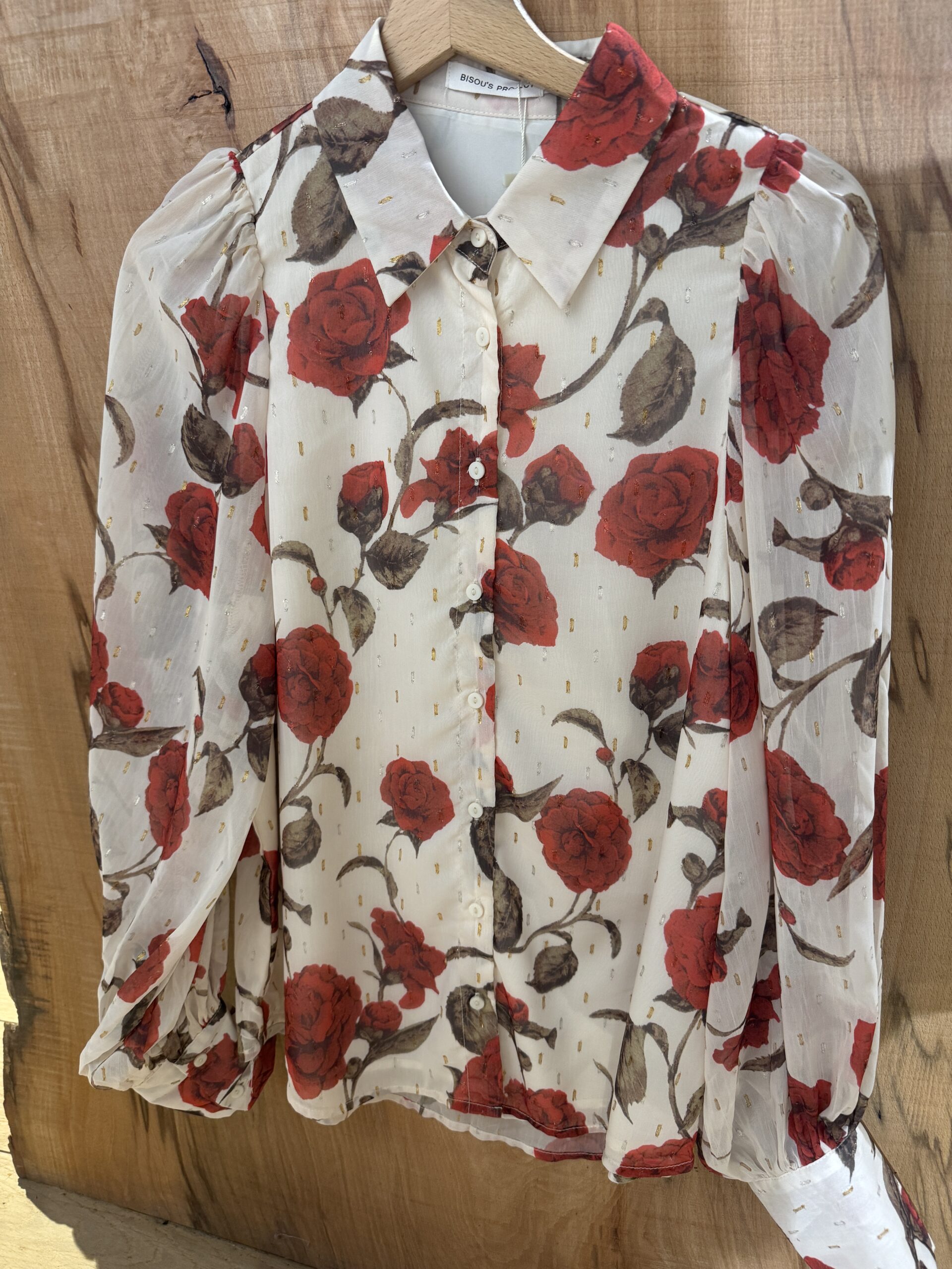 Chemise en voile beige avec des fleurs rouges.