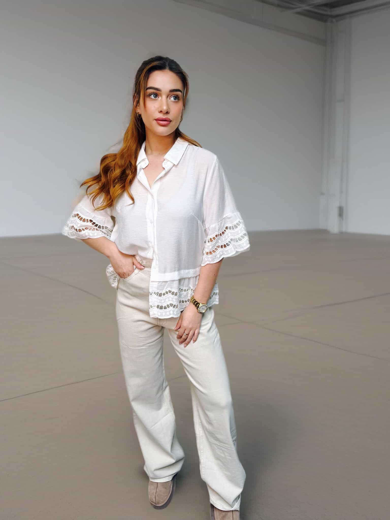 Chemise blanche , aux manches 3/4.