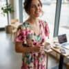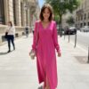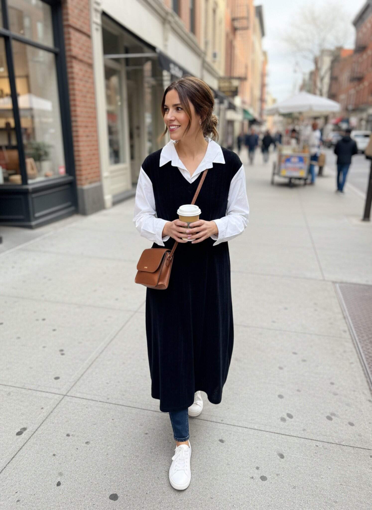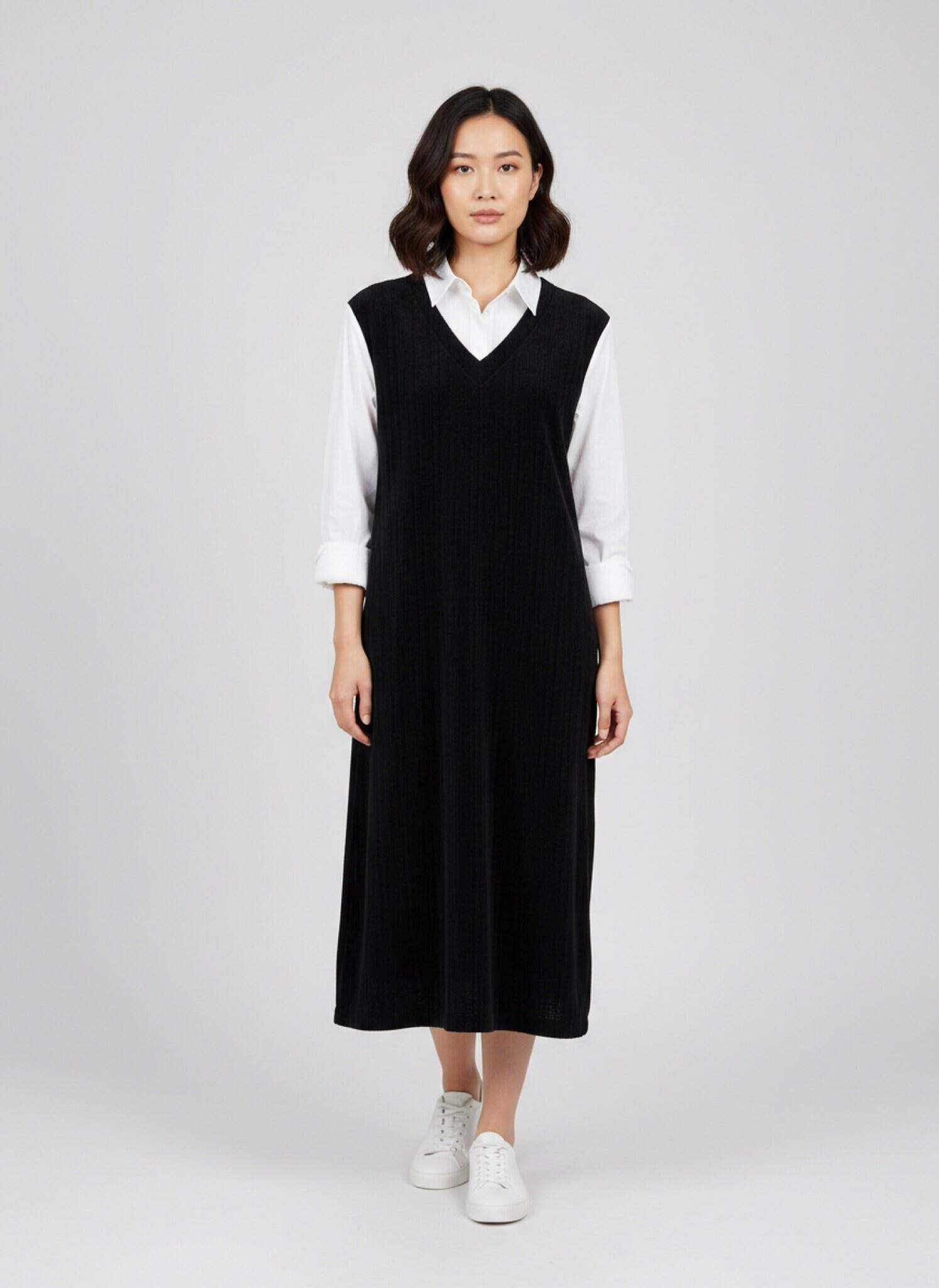 Longue robe en velour noir avec le col et les manches en chemise blanche.