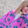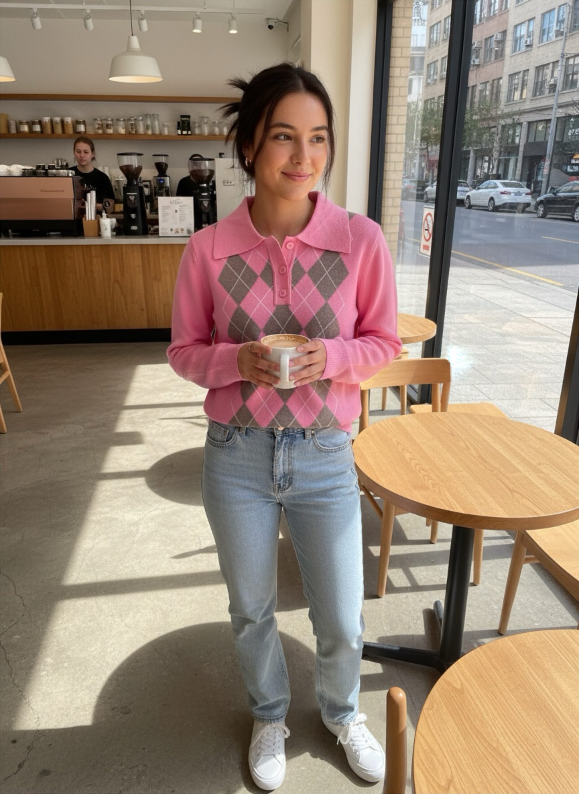 Pull fin style polo, rose avec des dessins de losanges taupes.