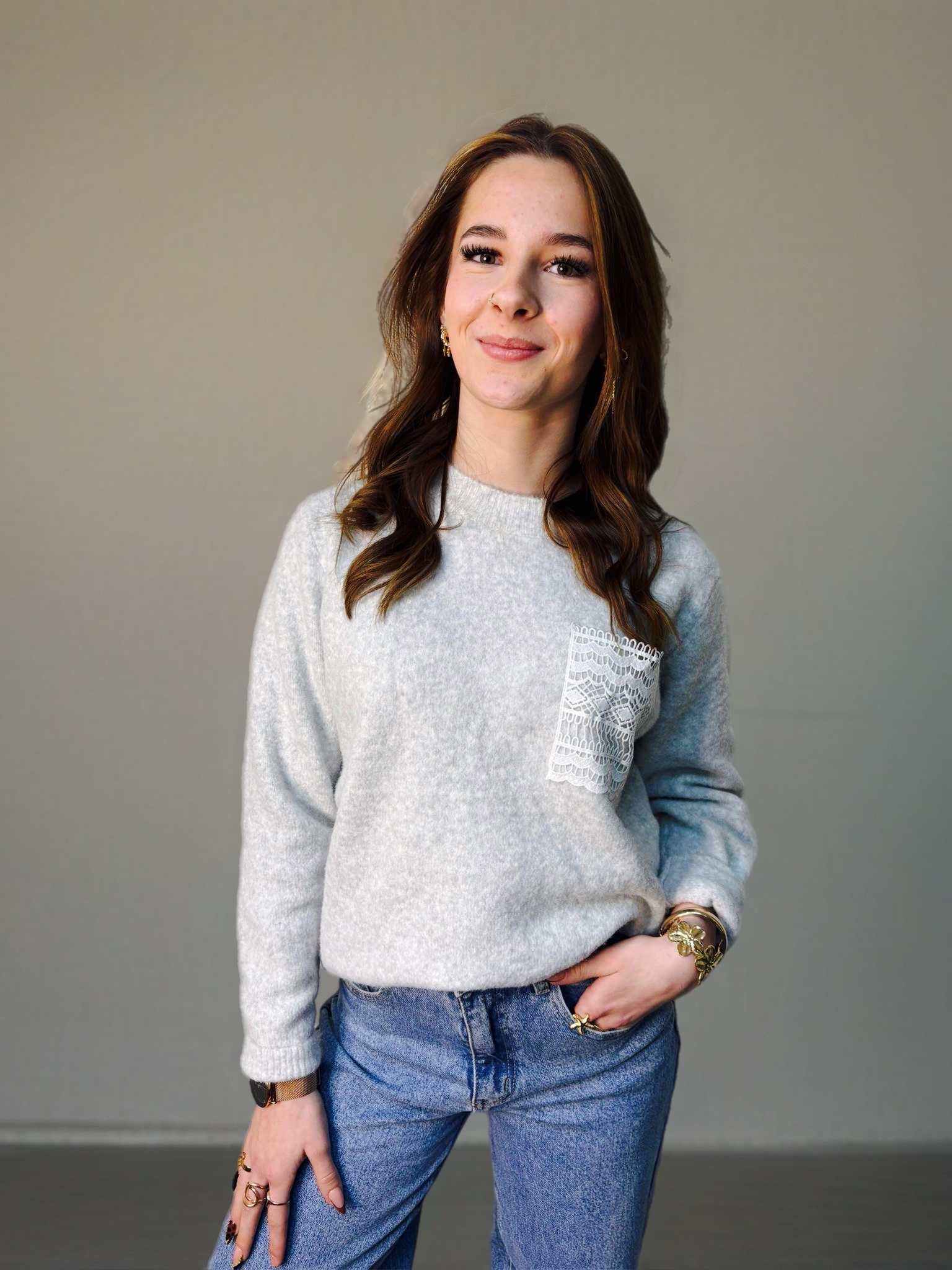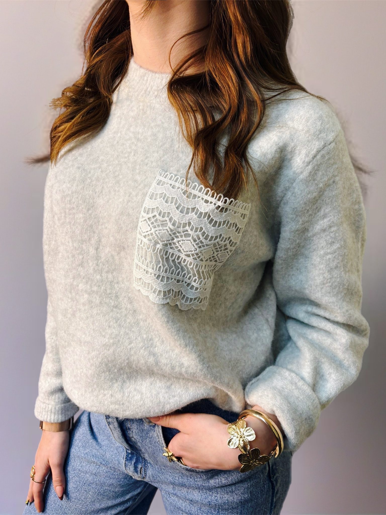 Pull gris clair avec une poche de dentelle blanche sur la poitrine.