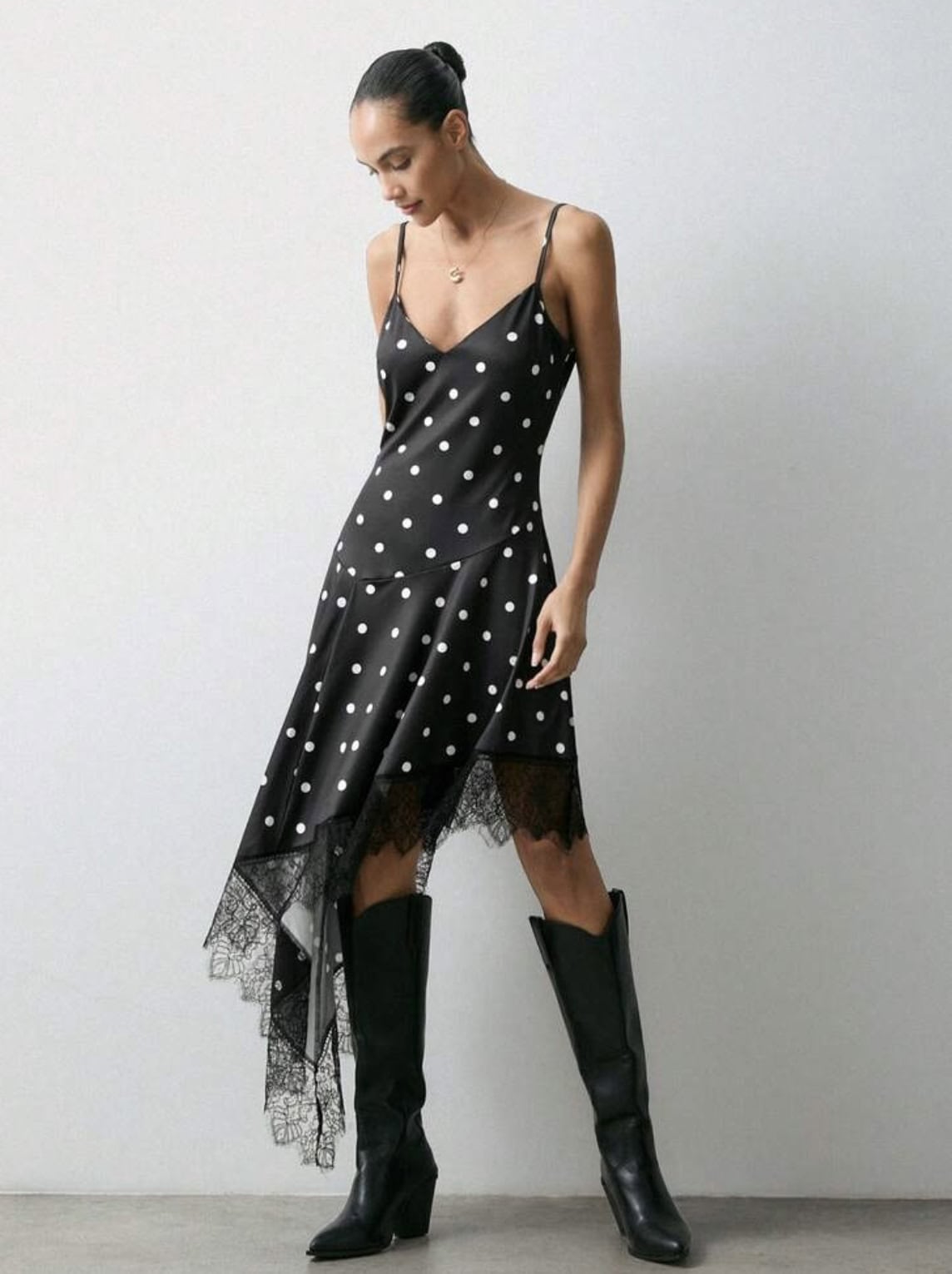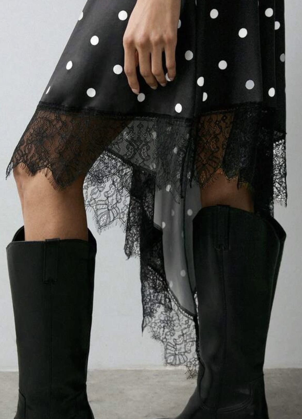 Dentelle dans le bas, avec un coté décentré en pointe.
