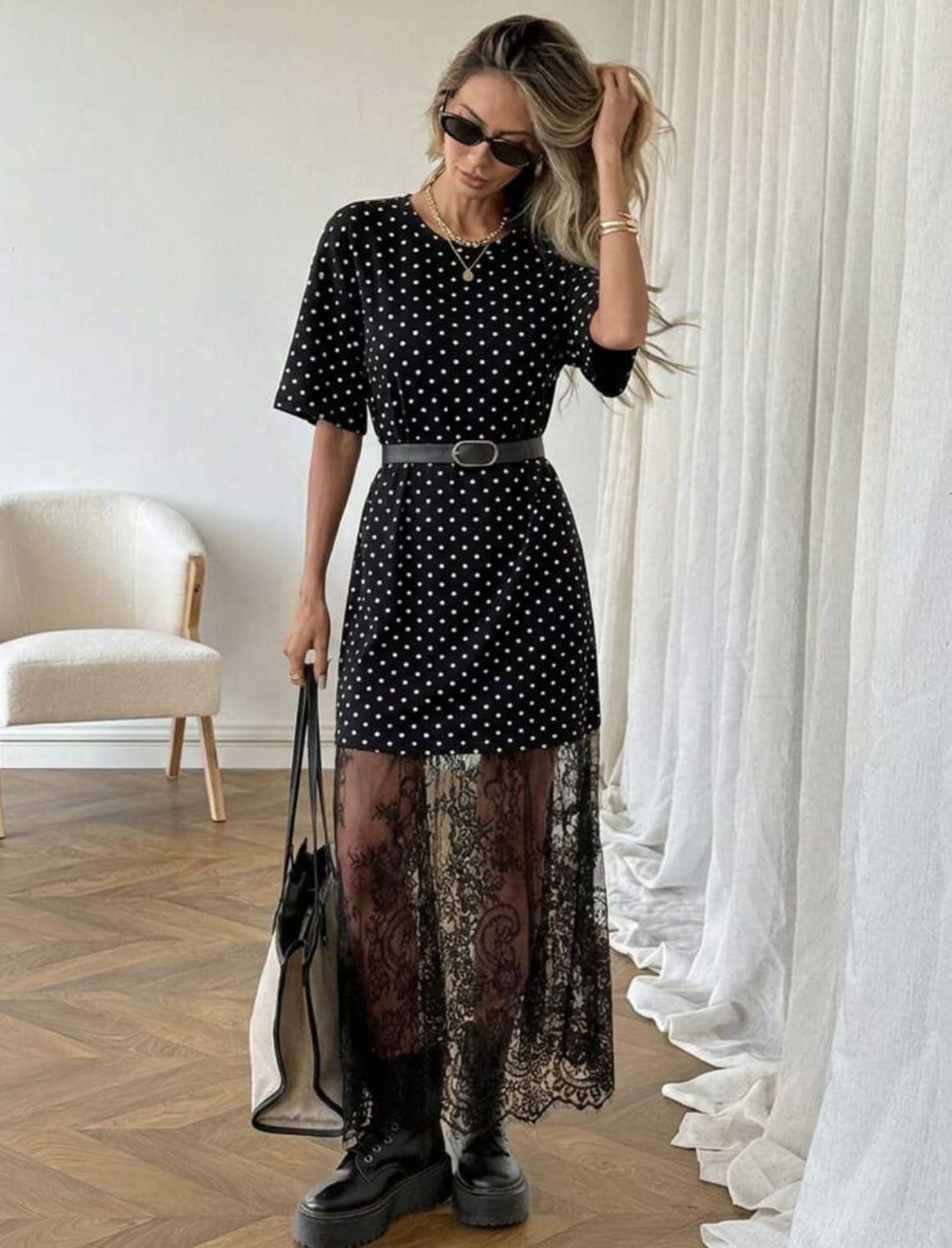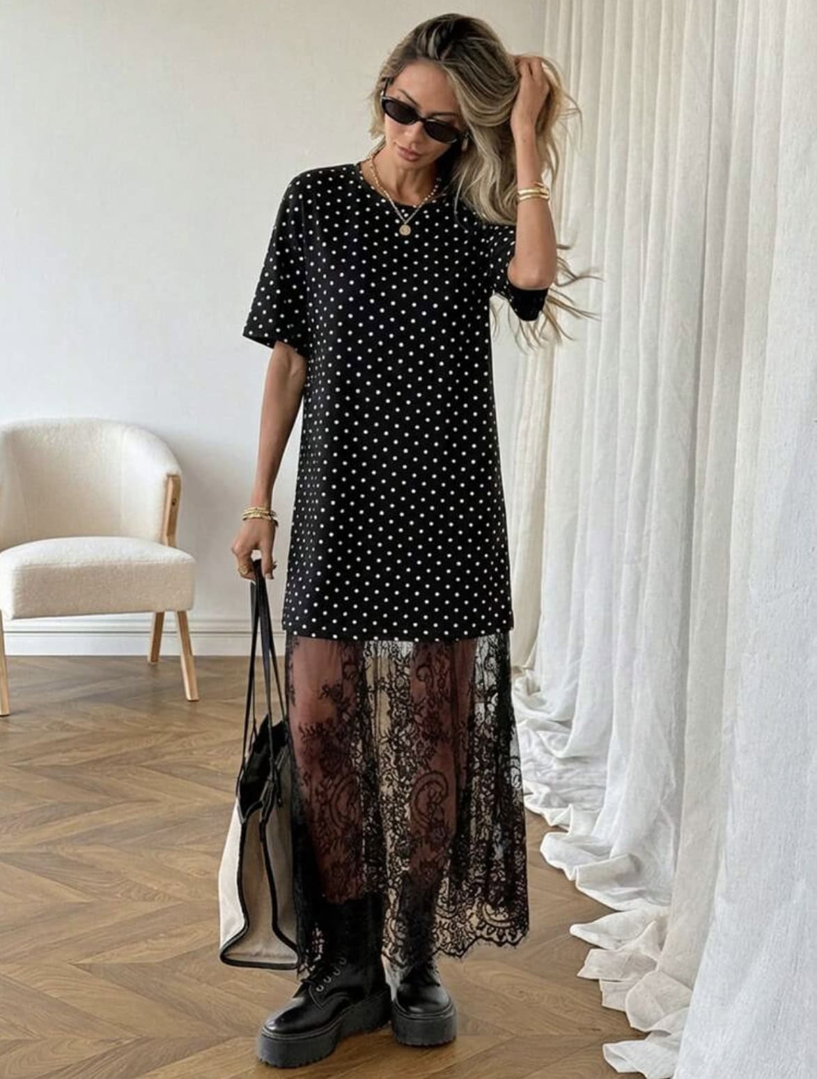 Longue robe en effet t-shirt à pois, avec de la dentelle noire transparente au jupon.