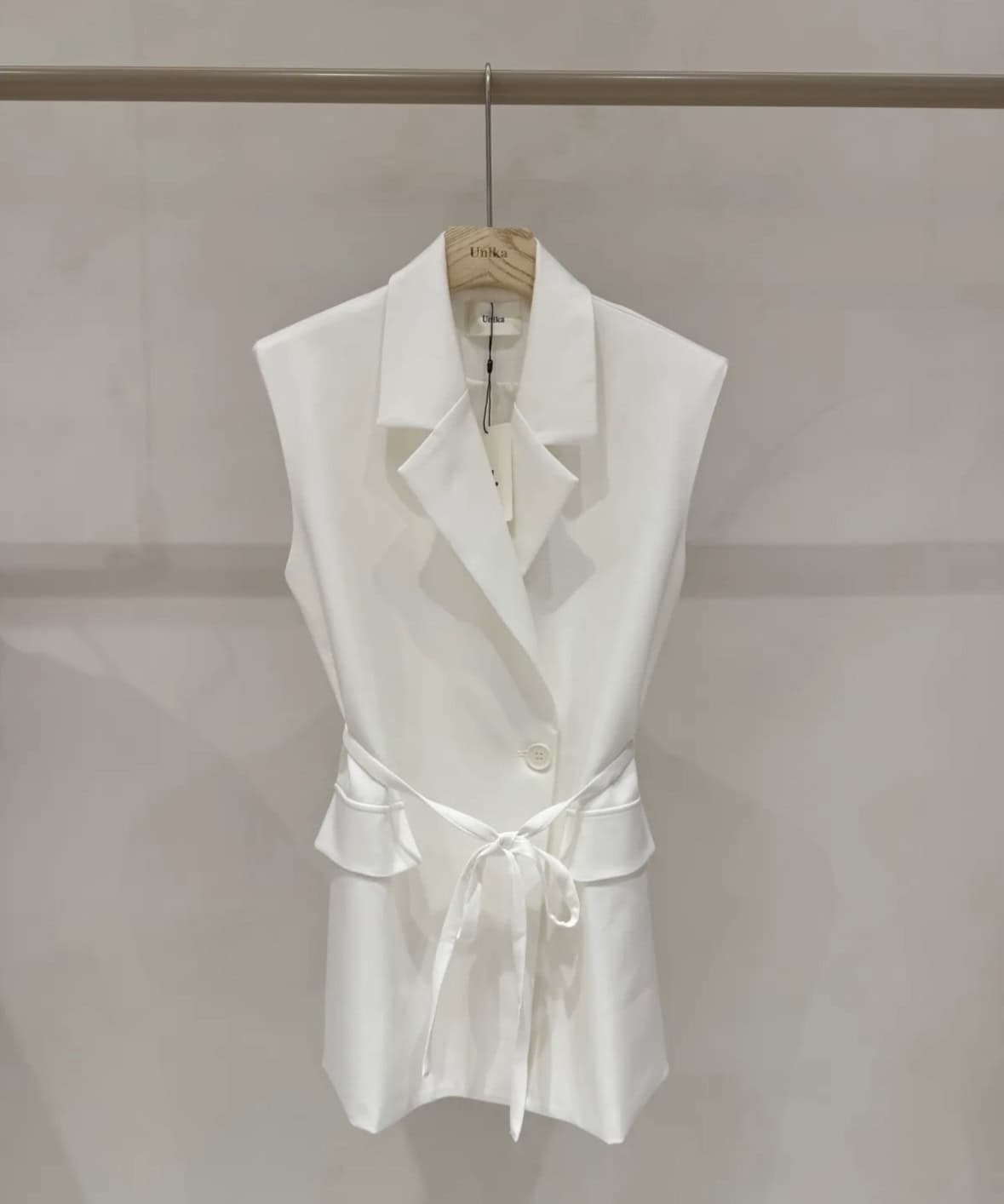 Fermeture par un bouton et une ceinture.