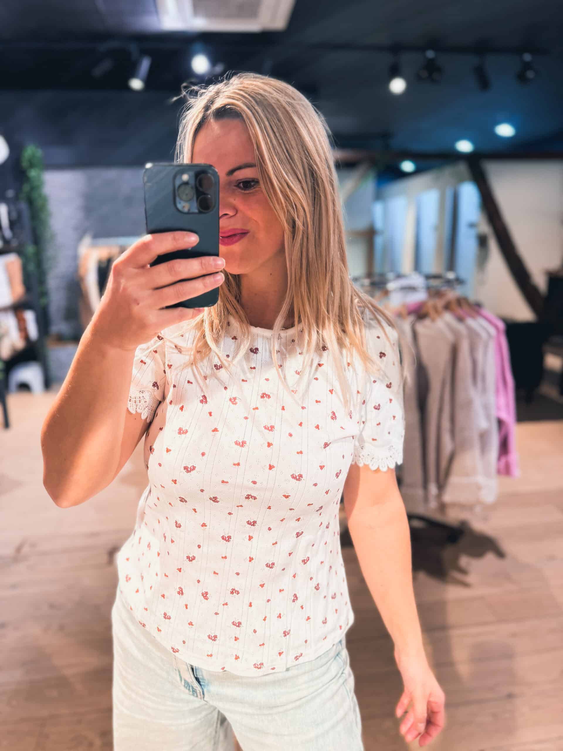 T-shirt blanc avec de petites fleurs rouges.