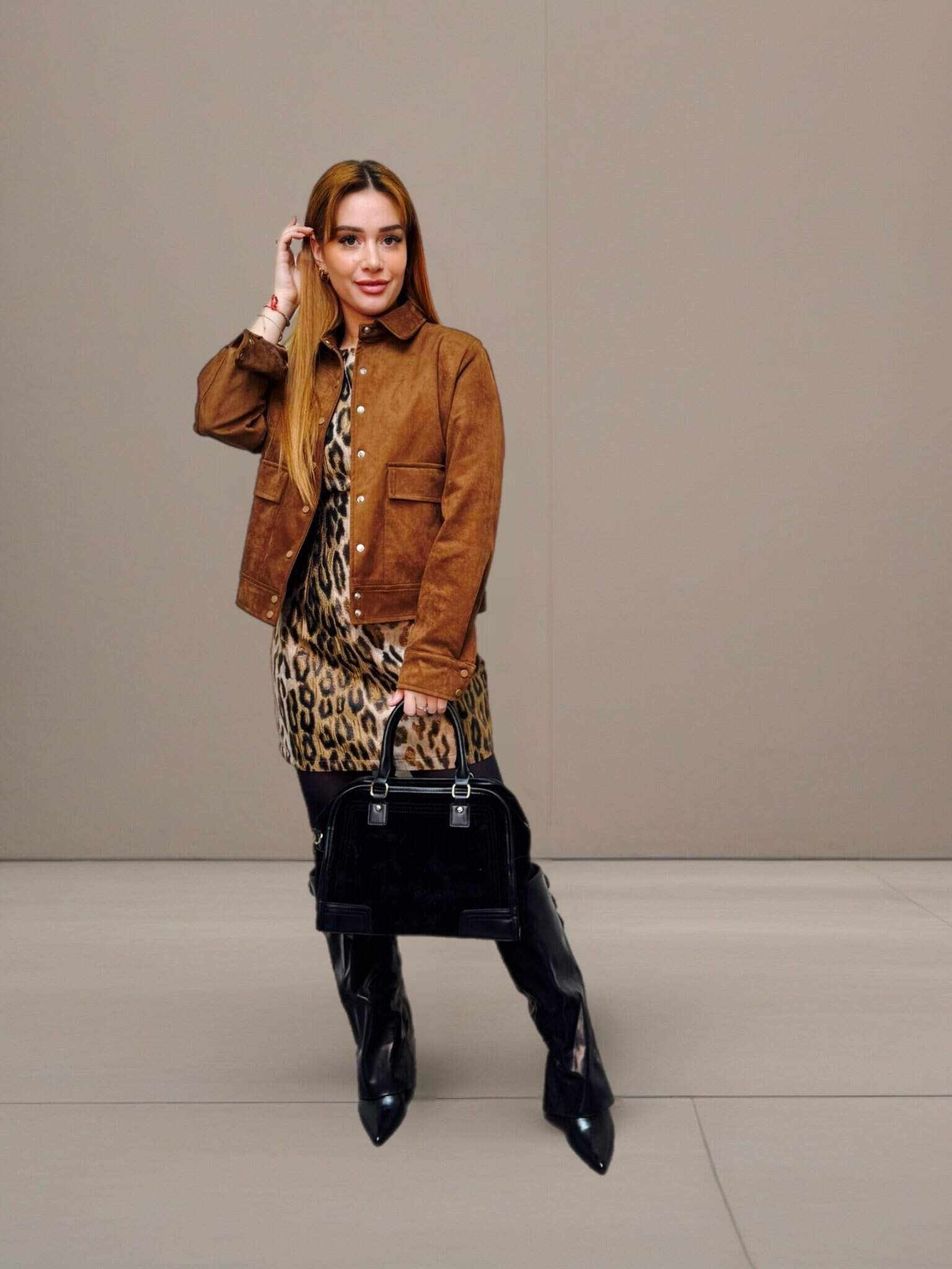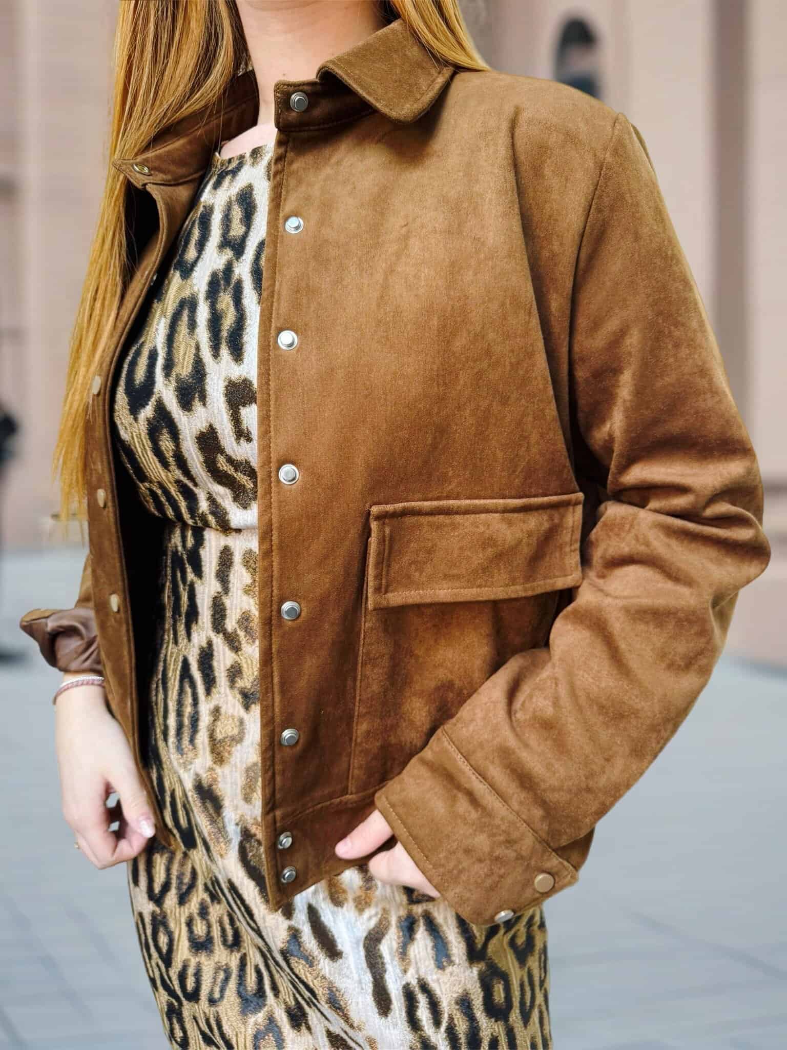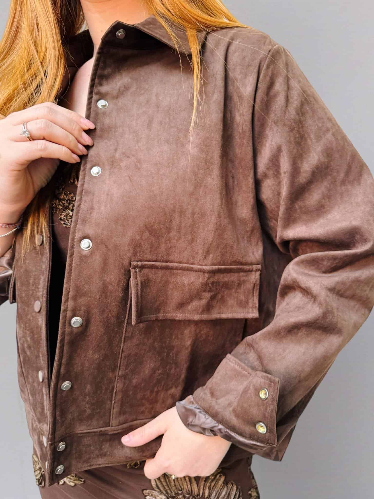 Veste en daim de couleur camel ou chocolat.